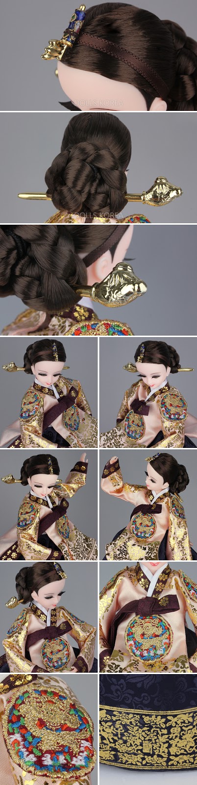 Her hair is elaborately styled, in a rolled braided bun, that sits at the base of her neck (this style is often referred to as a Chignon) and decorated with a brown ribbon this has been plaited into the hair, and a very ornate ornamental pin, called a "Binyeo". The ribbon was used to hold a "Cheupji" in place, sadly my doll is missing this part of her costume*.
